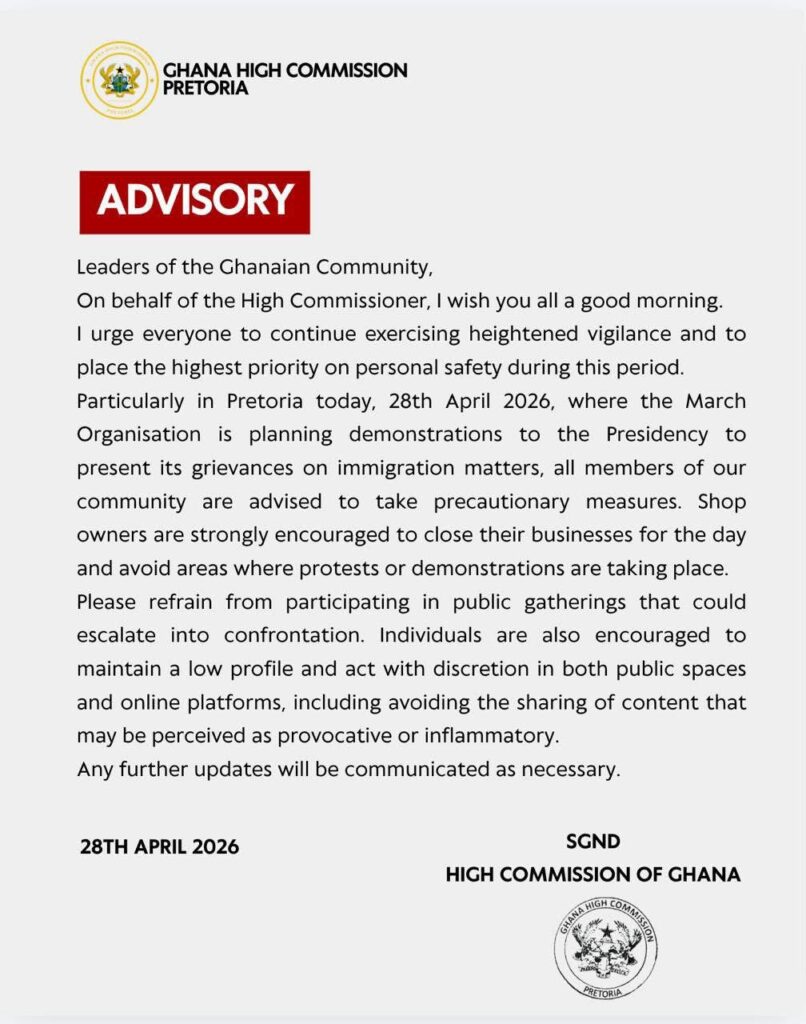 The advisory, released on April 28, 2026, cautioned members of the Ghanaian community to avoid protest areas, limit public exposure and take precautionary measures, particularly as the March Organisation prepares to stage demonstrations at the Presidency over immigration related grievances in Pretoria