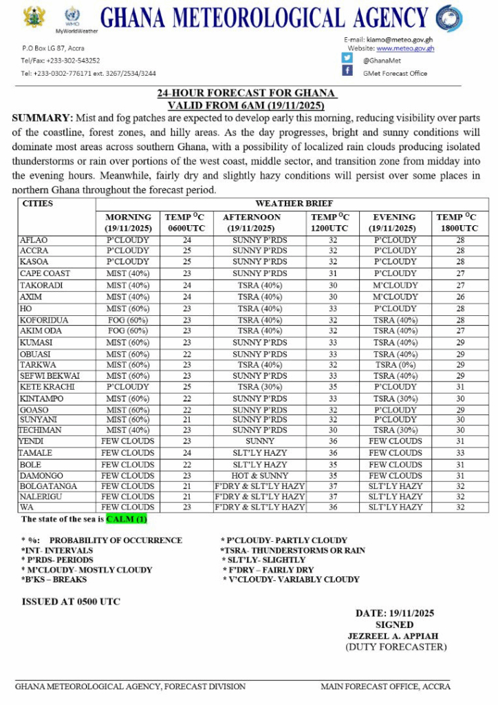 Meanwhile, northern Ghana is expected to remain fairly dry with slight haze, while southern areas will experience bright and sunny weather once the morning fog lifts.